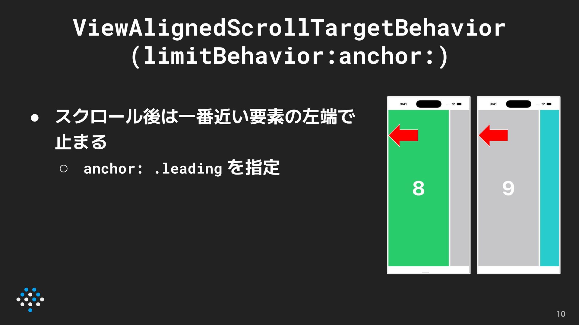 ◦ scrollTargetBehavior(_:) に渡して使用 • スクロールする要素の止まる位置をAnchorで指定 9 https://developer.apple.com/documentation/swiftui/view alignedscrolltargetbehavior/init(limitbehavior:anchor:)