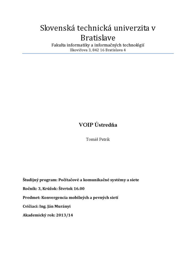 Ilkovičova 3, 842 16 Bratislava 4 VOIP Ústredňa Tomáš Petrík Študijný program: Počítačové a komunikačné systémy a siete Ročník: 3, Krúžok: Štvrtok 16.00 Predmet: Konvergencia mobilných a pevných sietí Cvičiaci: Ing. Ján Murányi Akademický rok: 2013/14