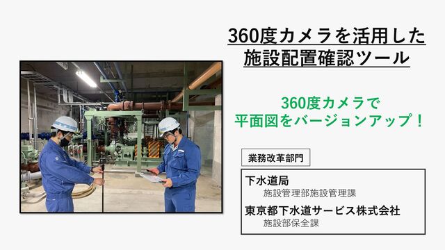 360度カメラを活用した 施設配置確認ツール 下水道局 施設管理部施設管理課 東京都下水道サービス株式会社 施設部保全課 360度カメラで 平面図をバージョンアップ! 業務改革部門