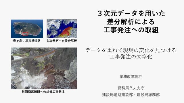 3次元データを用いた 差分解析による 工事発注への取組 総務局八丈支庁 建設局道路建設部・建設局総務部 データを重ねて現場の変化を見つける 工事発注の効率化 業務改革部門 青ヶ島:三宝港道路 3次元データ差分解析