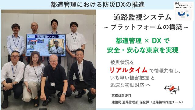 取組の内容 都道管理における防災DXの推進 ドローン映像 ウェアラブル映像 迅速な指示 協力会社 道路利用者 速やかな 規制情報の提供 交通管制センター スマホ タブレット 冠水の 確認 通報 冠水の 把握 対応へ 【被災情報の登録】 ~被災現場~ 【監視設備情報の確認】 監視カメラ 水位 センサ 警報 表示板 非常用設備 迅速な補修等 スマホ・タブレット で 管理情報を一元管理・クラウド化で情報共有 ・プラットフォーム【構築】 リアルタイムに情報共有 #4 リアルタイムに登録・確認!