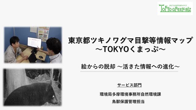 東京都ツキノワグマ目撃等情報マップ ~TOKYOくまっぷ~ 環境局多摩環境事務所自然環境課 鳥獣保護管理担当 絵からの脱却 ~活きた情報への進化~ サービス部門