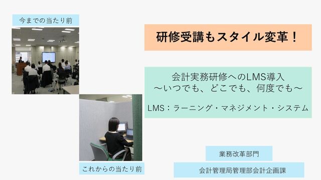 研修受講もスタイル変革! 会計管理局管理部会計企画課 会計実務研修へのLMS導入 ~いつでも、どこでも、何度でも~ LMS:ラーニング・マネジメント・システム 業務改革部門 今までの当たり前 これからの当たり前
