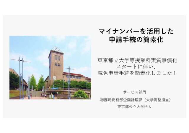 マイナンバーを活用した 申請手続の簡素化 総務局総務部企画計理課(大学調整担当) 東京都公立大学法人 東京都立大学等授業料実質無償化 スタートに伴い、 減免申請手続を簡素化しました! サービス部門
