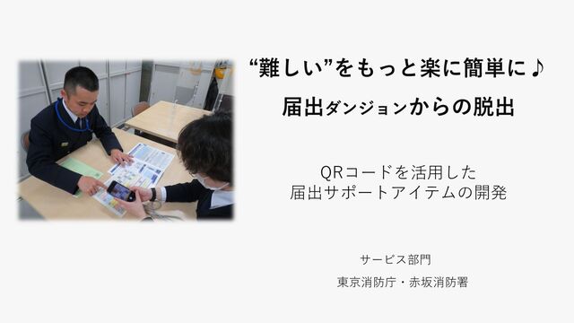 QRコードを活用した 届出サポートアイテムの開発 サービス部門 東京消防庁・赤坂消防署 “難しい”をもっと楽に簡単に♪ 届出ダンジョンからの脱出