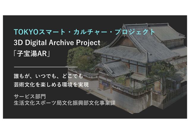 TOKYOスマート・カルチャー・プロジェクト 3D Digital Archive Project 誰もが、いつでも、どこでも 芸術文化を楽しめる環境を実現 サービス部門 生活文化スポーツ局文化振興部文化事業課 「子宝湯AR」