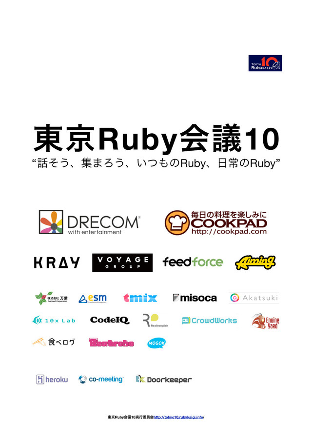 ౦ژRubyձٞ10 “ͦ͏ɺू·Ζ͏ɺ͍ͭͷRubyɺৗͷRuby” ౦ژRubyձٞ10࣮ߦҕһձhttp://tokyo10.rubykaigi.info/