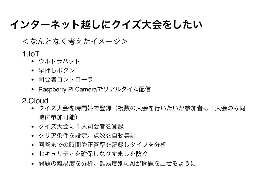 Raspberry Pi CameraͰϦΞϧλΠϜ৴ 2.Cloud • ΫΠζେձΛ࣌ؒଳͰొʢෳͷେձΛߦ͍͍͕ͨࢀՃऀ̍େձͷΈಉ ࣌ʹࢀՃՄೳʣ • ΫΠζେձʹ̍ਓ࢘ձऀΛొ • ΫϦΞ݅ΛઃఆɻΛࣗಈूܭ • ճ·Ͱͷ࣌ؒਖ਼Λه͠λΠϓΛੳ • ηΩϡϦςΟΛ֬อ͠ͳΓ͢·͠Λ͙ • ͷқΛੳɻқผʹAI͕Λग़ͤΔΑ͏ʹ