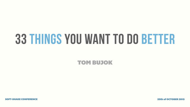 In this session we will cover 33 things you want to do better, quicker and simpler applying the best of Akka, Guava, Guice, Mockito, Spock, Byteman, Groovy, Gradle, Logback, Bash, Pomodoro and others! Using some real-life examples related to design, coding, testing and productivity we will have a peek at the code, analyze the flaw and propose a suitable solution. Not only will we learn how to code better, but more importantly, how to raise the bar on a daily basis. Come by and power up your craftsmanship!