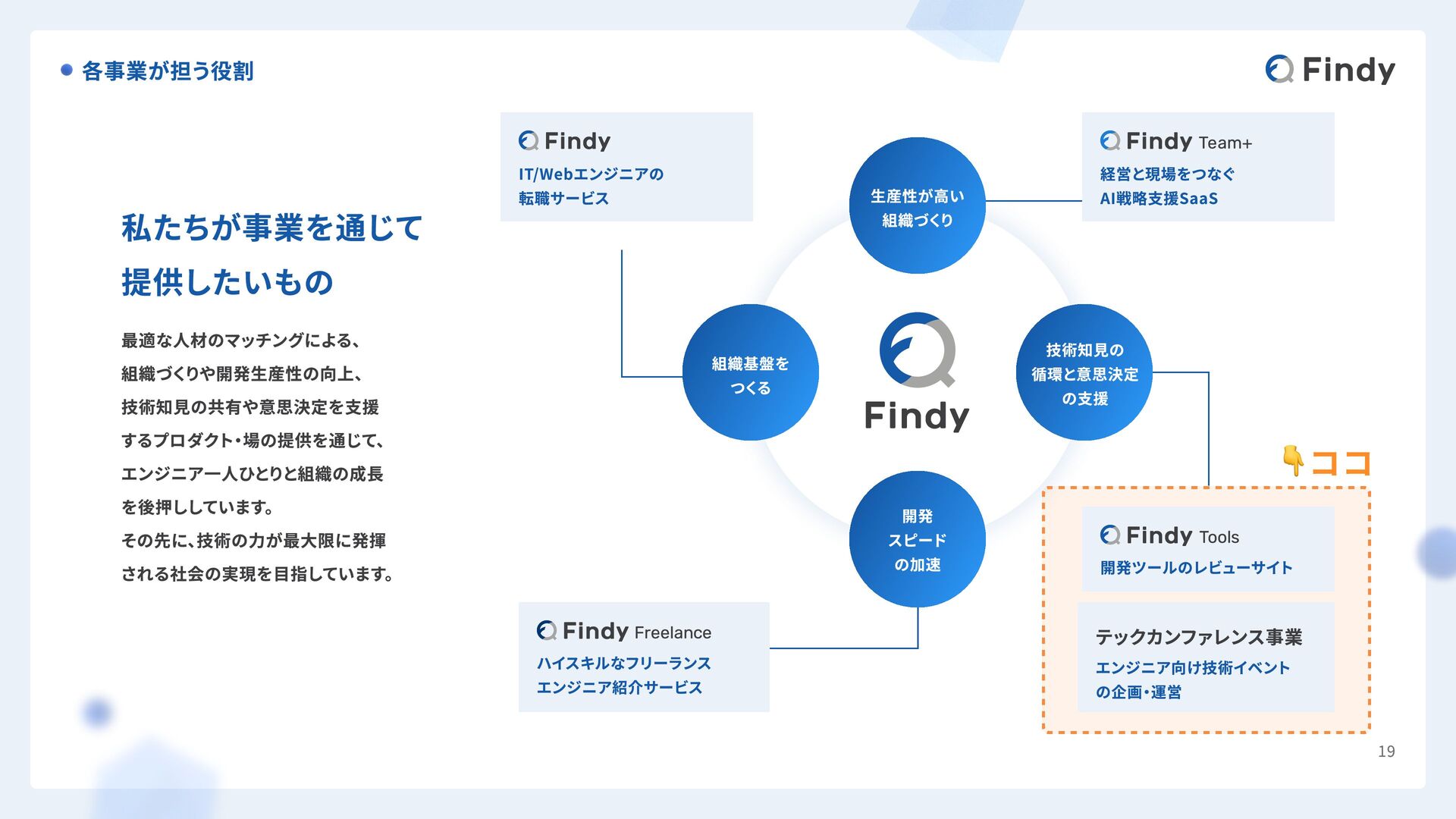 循環と意思決定 の支援 IT/Webエンジニアの 転職サービス ハイスキルなフリーランス エンジニア紹介サービス 経営と現場をつなぐ AI戦略支援SaaS 開発ツールのレビューサイト テックカンファレンス事業 エンジニア向け技術イベント の企画・運営 ココ 私たちが事業を通じて 提供したいもの 最適な人材のマッチングによる、 組織づくりや開発生産性の向上、 技術知見の共有や意思決定を支援 するプロダクト・場の提供を通じて、 エンジニア一人ひとりと組織の成長 を後押ししています。 その先に、 技術の力が最大限に発揮 される社会の実現を目指しています。