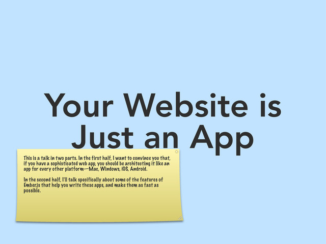In this talk, we'll explore why you should think of your web application as no different from an iOS or Android app, by moving 100% of logic and HTML to the browser. While other frameworks like Backbone help you embed "islands of richness" into the traditional page-by-page model, we'll also explore the tools Ember.js gives you to build real, honest-to-goodness apps that run entirely in the browser.