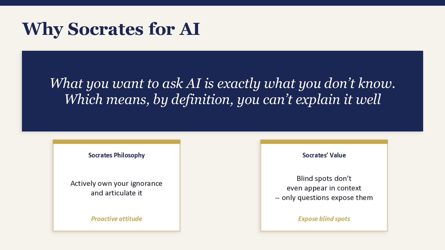 What you want to ask AI is exactly what you don't know. Which means, by definition, you can't explain it well. This fundamental paradox is where Socrates comes in. Some practical techniques is developed through Socratic dialogue.