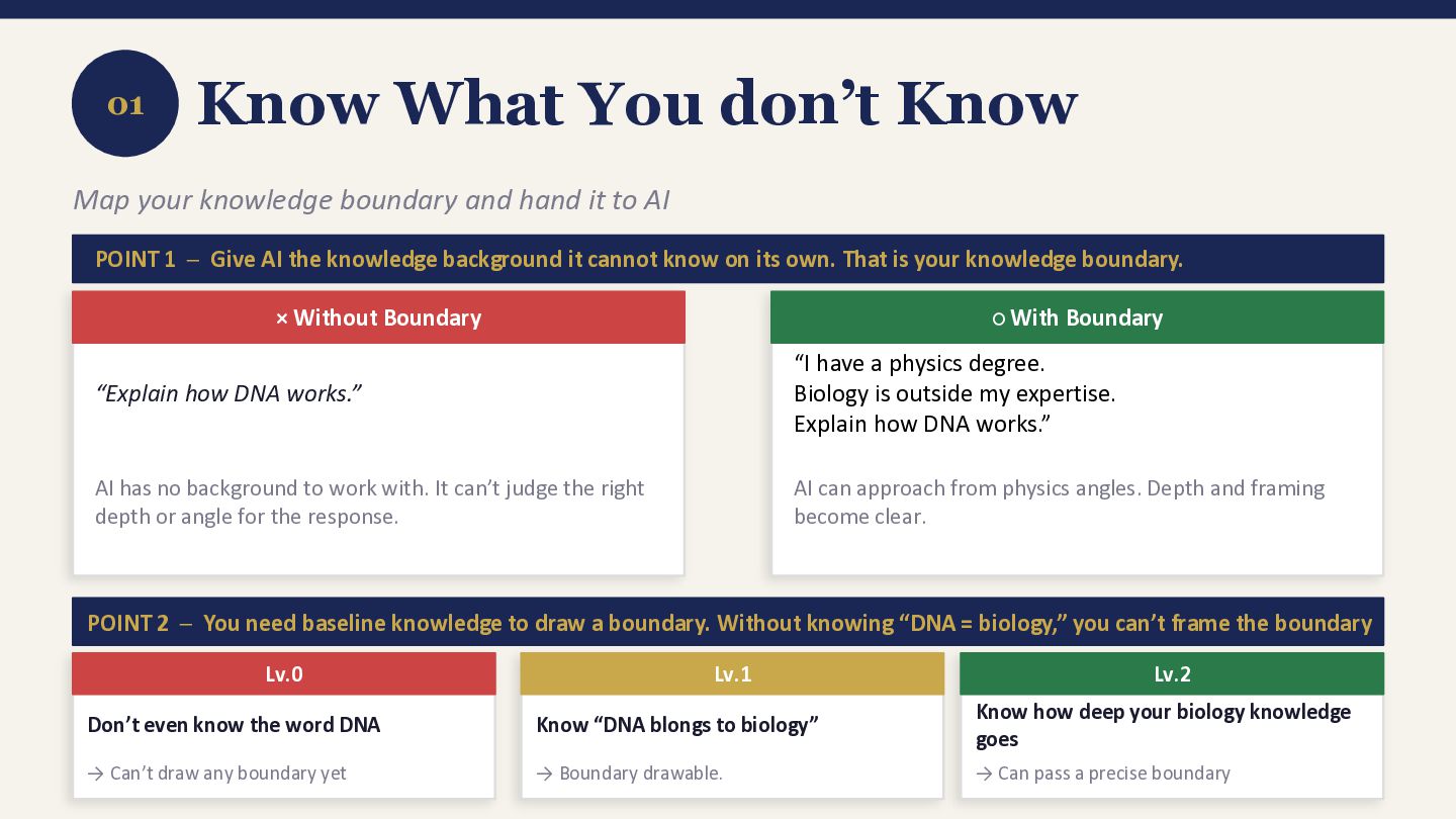 AI the knowledge background it cannot know on its own. That is your knowledge boundary. × Without Boundary “Explain how DNA works.” AI has no background to work with. It can’t judge the right depth or angle for the response. ◦ With Boundary “I have a physics degree. Biology is outside my expertise. Explain how DNA works.” AI can approach from physics angles. Depth and framing become clear. POINT 2 ─ You need baseline knowledge to draw a boundary. Without knowing “DNA = biology,” you can’t frame the boundary Lv.0 Don’t even know the word DNA → Can’t draw any boundary yet Lv.1 Know “DNA blongs to biology” → Boundary drawable. Lv.2 Know how deep your biology knowledge goes → Can pass a precise boundary Map your knowledge boundary and hand it to AI