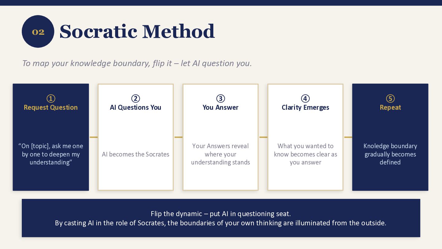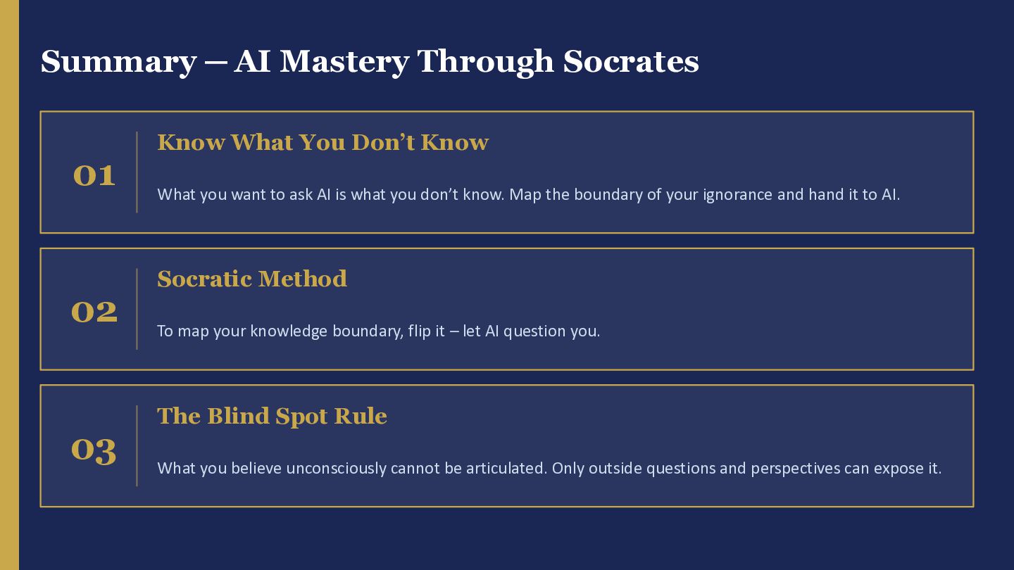 Don’t Know What you want to ask AI is what you don’t know. Map the boundary of your ignorance and hand it to AI. 02 Socratic Method To map your knowledge boundary, flip it – let AI question you. 03 The Blind Spot Rule What you believe unconsciously cannot be articulated. Only outside questions and perspectives can expose it.