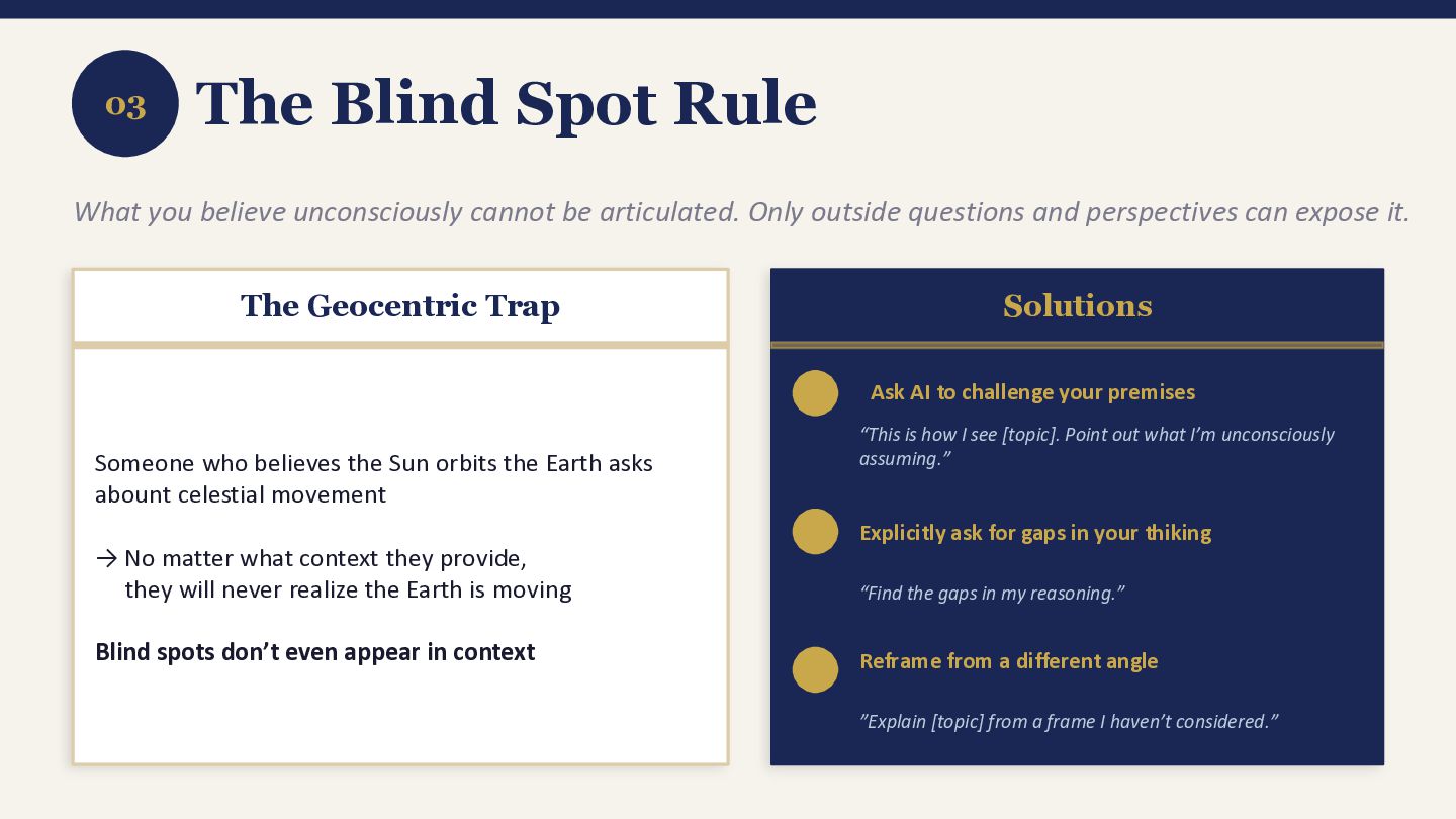 be articulated. Only outside questions and perspectives can expose it. The Geocentric Trap Someone who believes the Sun orbits the Earth asks abount celestial movement → No matter what context they provide, they will never realize the Earth is moving Blind spots don’t even appear in context Solutions Ask AI to challenge your premises “This is how I see [topic]. Point out what I’m unconsciously assuming.” Explicitly ask for gaps in your thiking “Find the gaps in my reasoning.” Reframe from a different angle ”Explain [topic] from a frame I haven’t considered.”