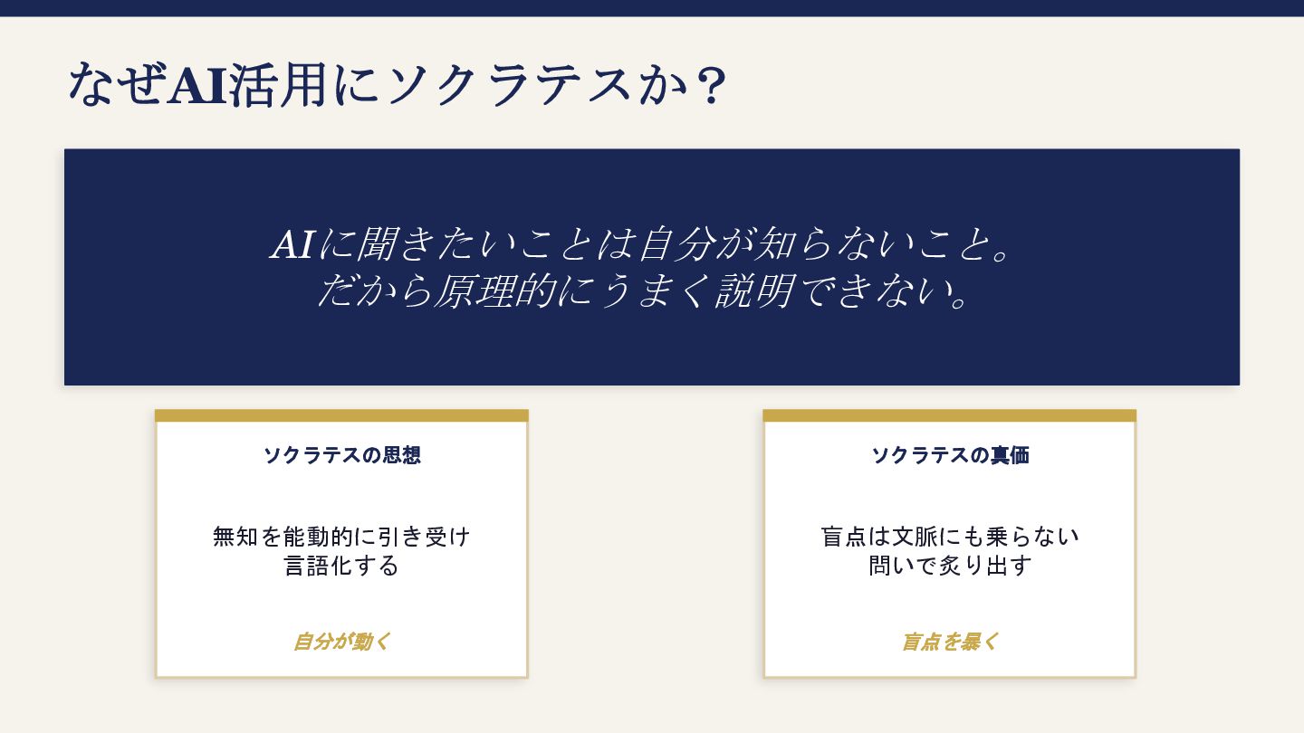 なぜAI活用にソクラテスか? AIに聞きたいことは自分が知らないこと。 だから原理的にうまく説明できない。 ソクラテスの思想 無知を能動的に引き受け 言語化する 自分が動く ソクラテスの真価 盲点は文脈にも乗らない 問いで炙り出す