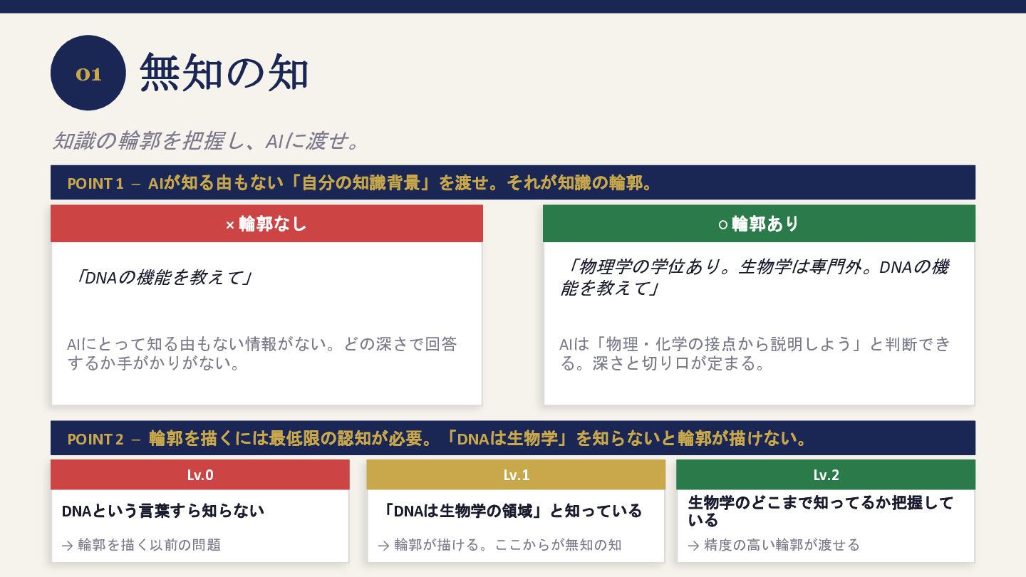 するか手がかりがない。 ◦ 輪郭あり 「物理学の学位あり。生物学は専門外。DNAの機 能を教えて」 AIは「物理・化学の接点から説明しよう」と判断でき る。深さと切り口が定まる。 POINT 2 ─ 輪郭を描くには最低限の認知が必要。「DNAは生物学」を知らないと輪郭が描けない。 Lv.0 DNAという言葉すら知らない → 輪郭を描く以前の問題 Lv.1 「DNAは生物学の領域」と知っている → 輪郭が描ける。ここからが無知の知 Lv.2 生物学のどこまで知ってるか把握して いる → 精度の高い輪郭が渡せる 知識の輪郭を把握し、AIに渡せ。