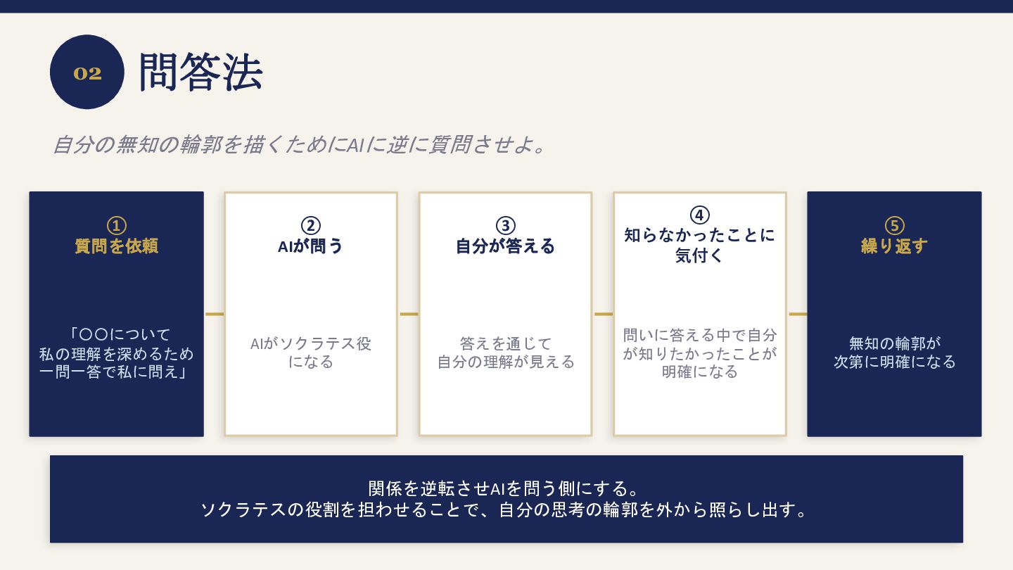 02 問答法 自分の無知の輪郭を描くためにAIに逆に質問させよ。 ① 質問を依頼 「〇〇について 私の理解を深めるため 一問一答で私に問え」 ② AIが問う