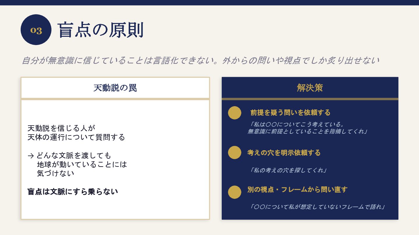 03 盲点の原則 自分が無意識に信じていることは言語化できない。外からの問いや視点でしか炙り出せない 天動説の罠 天動説を信じる人が 天体の運行について質問する → どんな文脈を渡しても 地球が動いていることには 気づけない