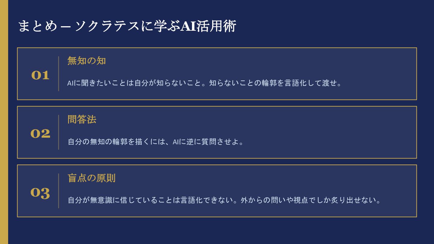 まとめ ─ ソクラテスに学ぶAI活用術 01 無知の知 AIに聞きたいことは自分が知らないこと。知らないことの輪郭を言語化して渡せ。 02 問答法 自分の無知の輪郭を描くには、AIに逆に質問させよ。 03