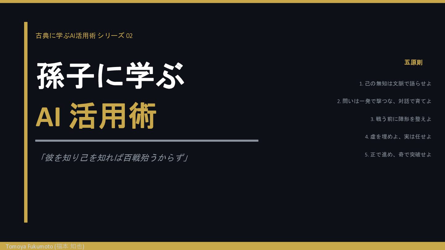 古典に学ぶAI活用術 シリーズ 02 孫子に学ぶ AI 活用術 「彼を知り己を知れば百戦殆うからず」 五原則 1. 己の無知は文脈で語らせよ