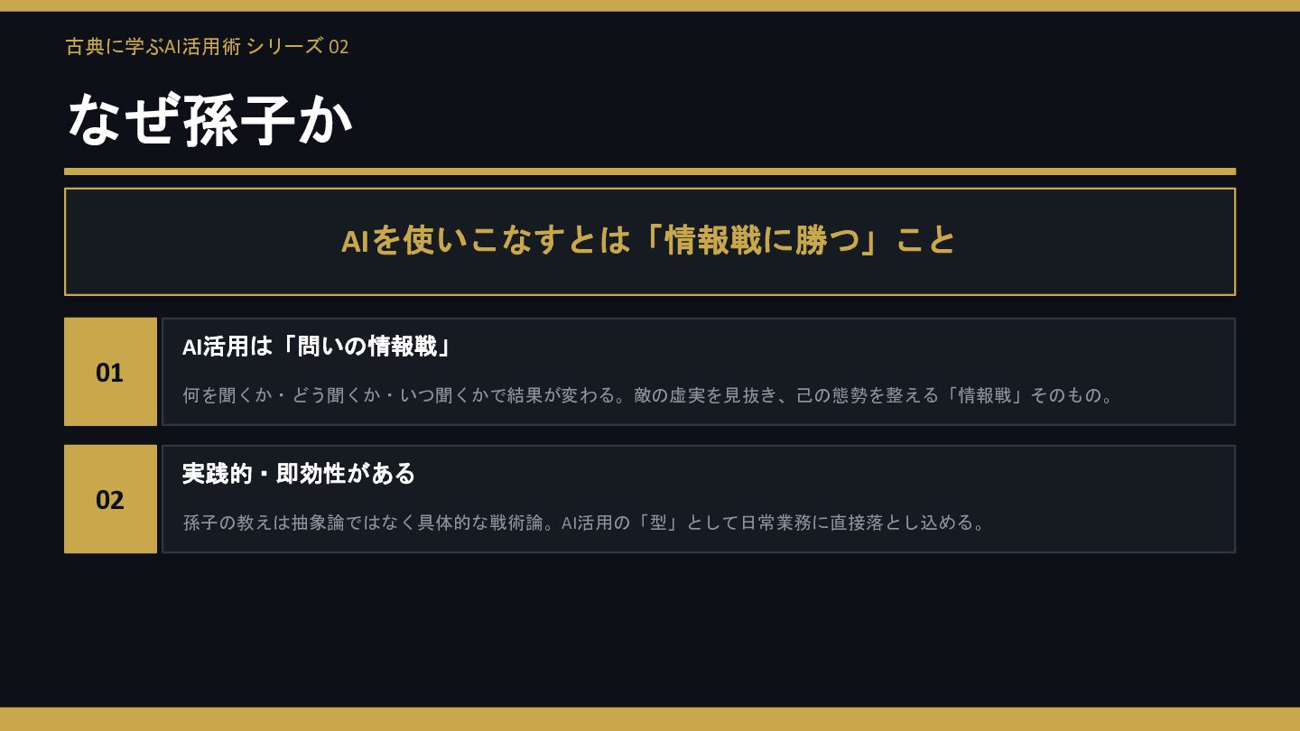 古典に学ぶAI活用術 シリーズ 02 なぜ孫子か AIを使いこなすとは「情報戦に勝つ」こと 01 AI活用は「問いの情報戦」 何を聞くか・どう聞くか・いつ聞くかで結果が変わる。敵の虚実を見抜き、己の態勢を整える「情報戦」そのもの。 02 実践的・即効性がある