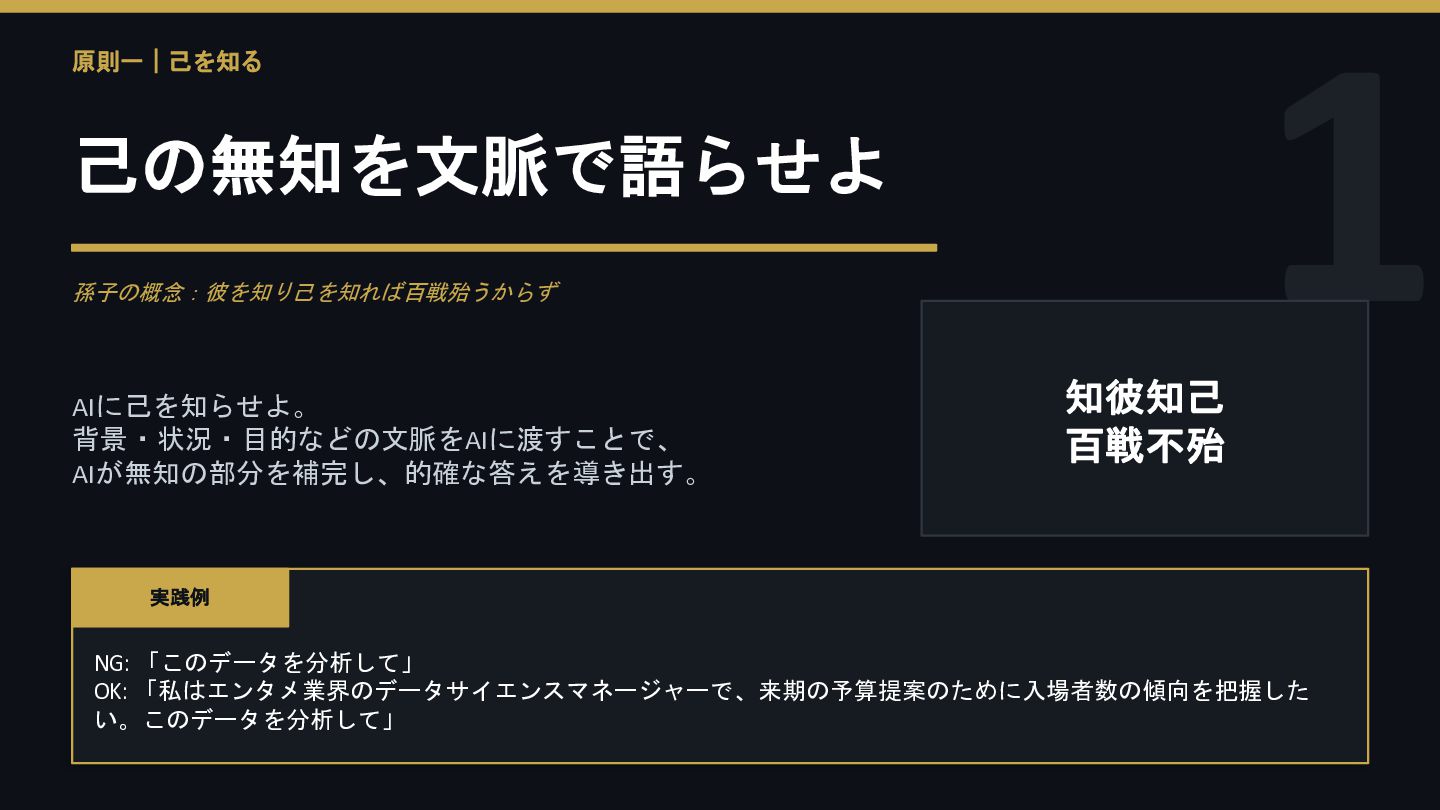 1 原則一|己を知る 己の無知を文脈で語らせよ 孫子の概念:彼を知り己を知れば百戦殆うからず AIに己を知らせよ。 背景・状況・目的などの文脈をAIに渡すことで、 AIが無知の部分を補完し、的確な答えを導き出す。 知彼知己 百戦不殆 実践例