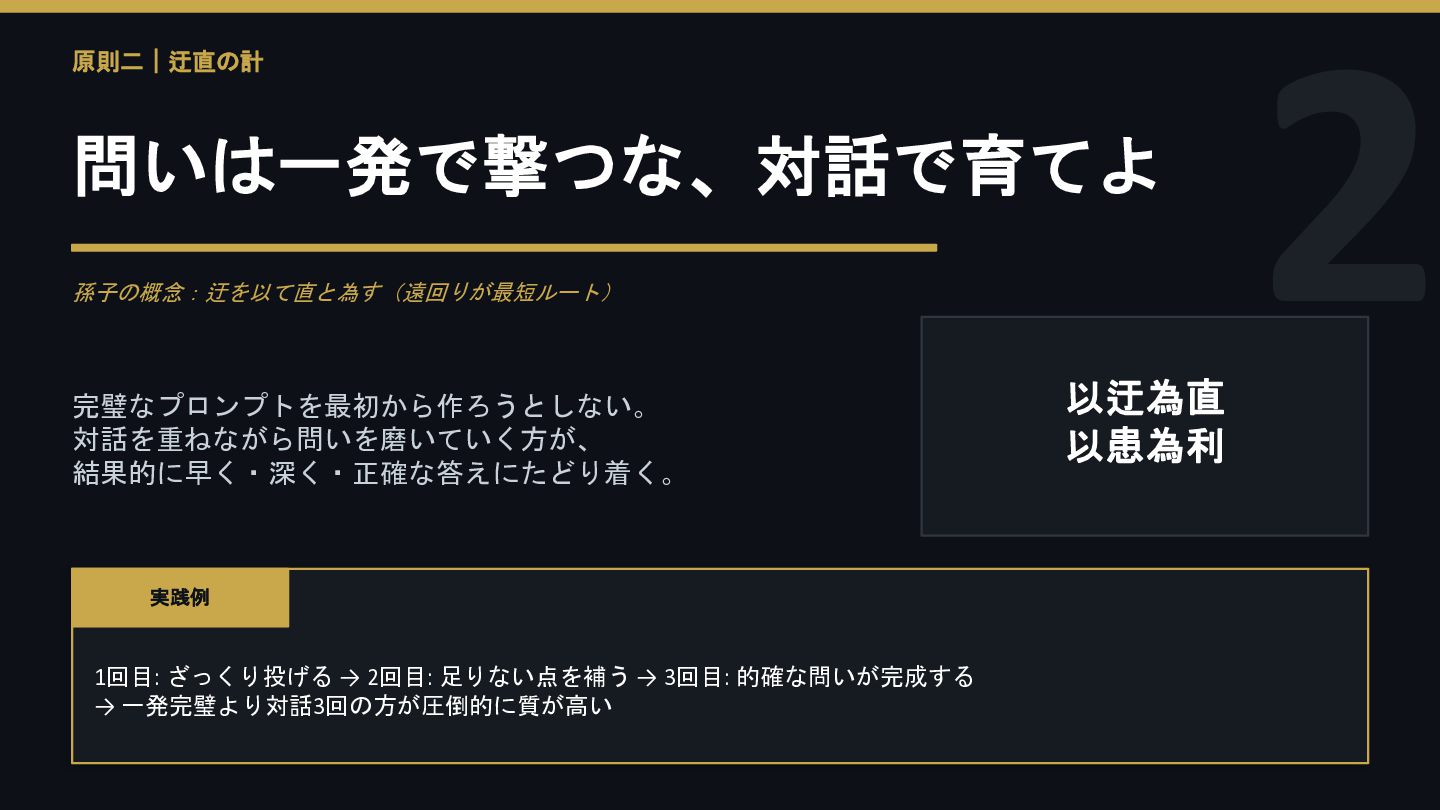 2 原則二|迂直の計 問いは一発で撃つな、対話で育てよ 孫子の概念:迂を以て直と為す(遠回りが最短ルート) 完璧なプロンプトを最初から作ろうとしない。 対話を重ねながら問いを磨いていく方が、 結果的に早く・深く・正確な答えにたどり着く。 以迂為直 以患為利 実践例