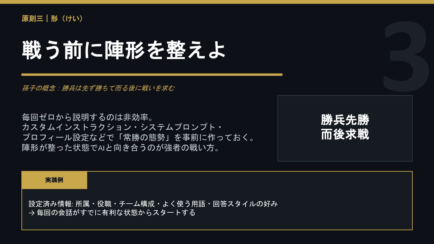 3 原則三|形(けい) 戦う前に陣形を整えよ 孫子の概念:勝兵は先ず勝ちて而る後に戦いを求む 毎回ゼロから説明するのは非効率。 カスタムインストラクション・システムプロンプト・ プロフィール設定などで「常勝の態勢」を事前に作っておく。 陣形が整った状態でAIと向き合うのが強者の戦い方。 勝兵先勝 而後求戦