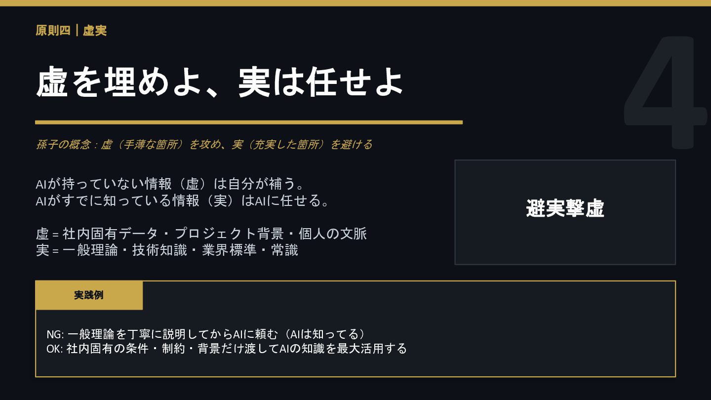 4 原則四|虚実 虚を埋めよ、実は任せよ 孫子の概念:虚(手薄な箇所)を攻め、実(充実した箇所)を避ける AIが持っていない情報(虚)は自分が補う。 AIがすでに知っている情報(実)はAIに任せる。 虚 = 社内固有データ・プロジェクト背景・個人の文脈 実
