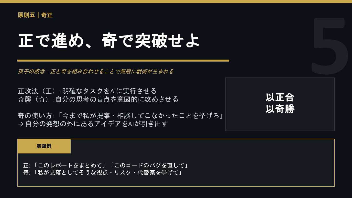 5 原則五|奇正 正で進め、奇で突破せよ 孫子の概念:正と奇を組み合わせることで無限に戦術が生まれる 正攻法(正): 明確なタスクをAIに実行させる 奇襲(奇): 自分の思考の盲点を意図的に攻めさせる 奇の使い方: 「今まで私が提案・相談してこなかったことを挙げろ」