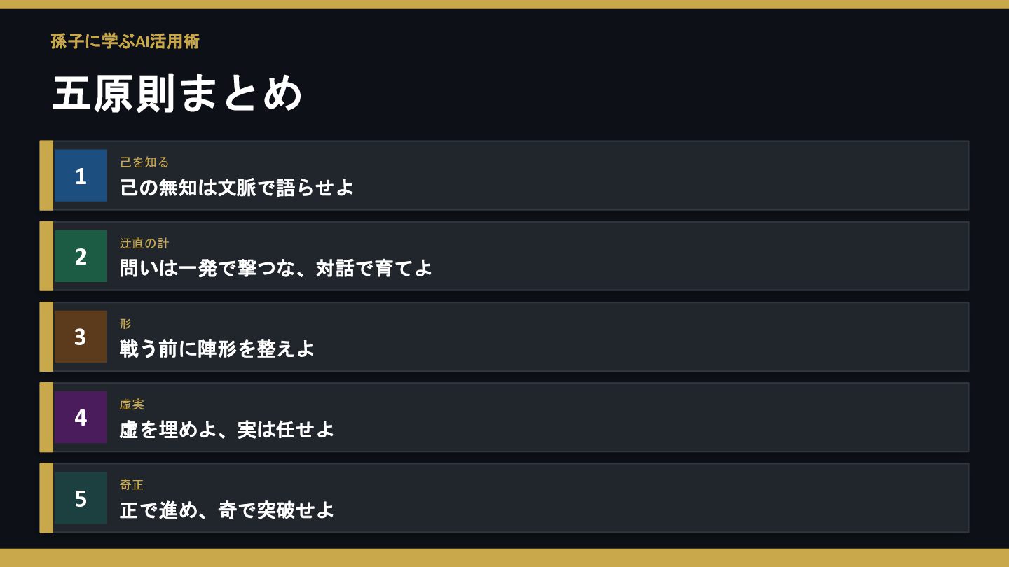 孫子に学ぶAI活用術 五原則まとめ 1 己を知る 己の無知は文脈で語らせよ 2 迂直の計 問いは一発で撃つな、対話で育てよ 3 形