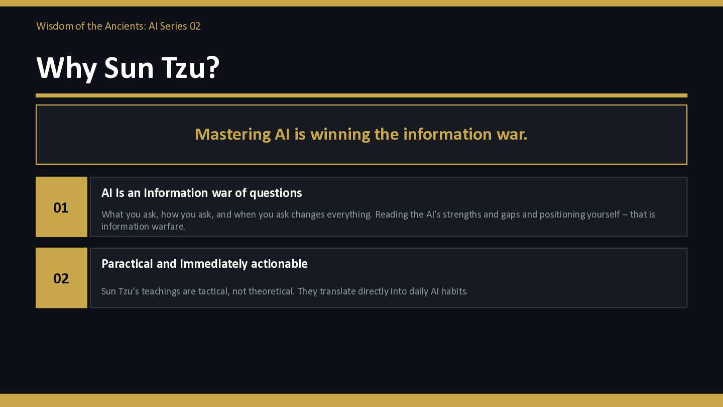 Mastering AI is winning the information war. 01 AI Is an Information war of questions What you ask, how you ask, and when you ask changes everything. Reading the AI’s strengths and gaps and positioning yourself – that is information warfare. 02 Paractical and Immediately actionable Sun Tzu’s teachings are tactical, not theoretical. They translate directly into daily AI habits.