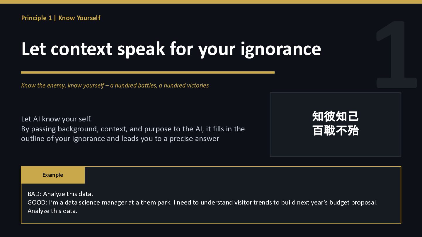 your ignorance Know the enemy, know yourself – a hundred battles, a hundred victories Let AI know your self. By passing background, context, and purpose to the AI, it fills in the outline of your ignorance and leads you to a precise answer 知彼知己 百戦不殆 Example BAD: Analyze this data. GOOD: I’m a data science manager at a them park. I need to understand visitor trends to build next year’s budget proposal. Analyze this data.