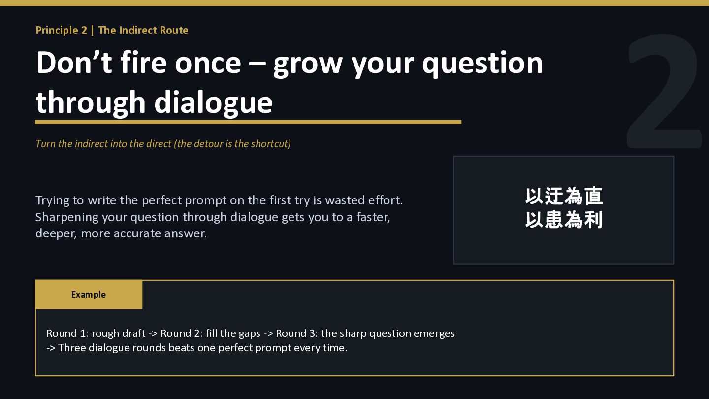 – grow your question through dialogue Turn the indirect into the direct (the detour is the shortcut) Trying to write the perfect prompt on the first try is wasted effort. Sharpening your question through dialogue gets you to a faster, deeper, more accurate answer. 以迂為直 以患為利 Example Round 1: rough draft -> Round 2: fill the gaps -> Round 3: the sharp question emerges -> Three dialogue rounds beats one perfect prompt every time.