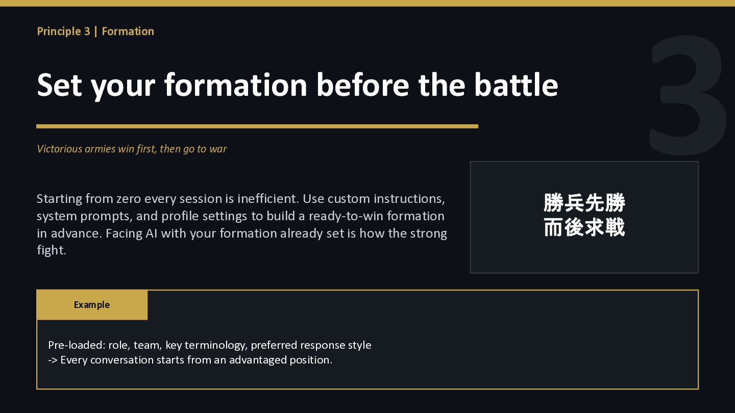battle Victorious armies win first, then go to war Starting from zero every session is inefficient. Use custom instructions, system prompts, and profile settings to build a ready-to-win formation in advance. Facing AI with your formation already set is how the strong fight. 勝兵先勝 而後求戦 Example Pre-loaded: role, team, key terminology, preferred response style -> Every conversation starts from an advantaged position.