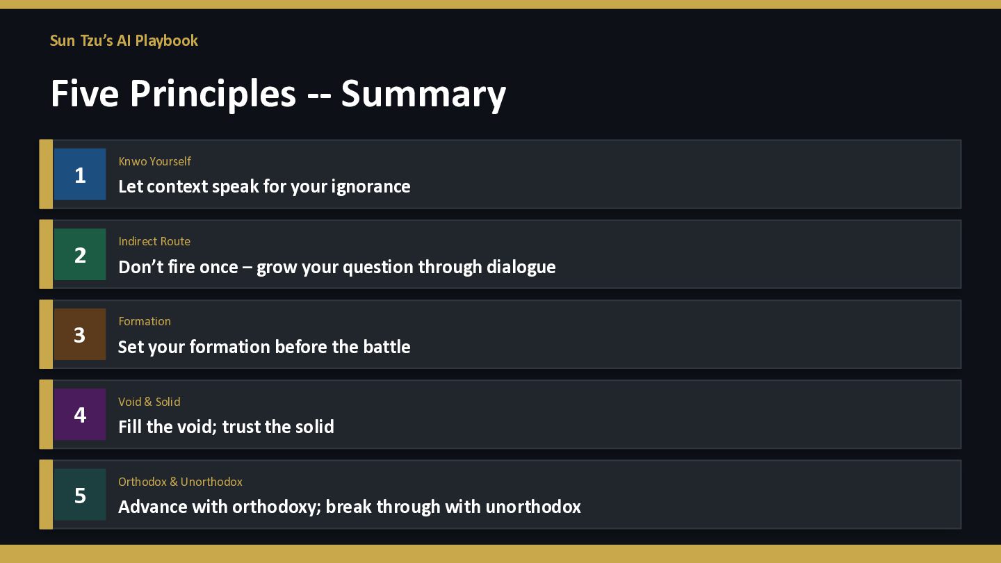 Yourself Let context speak for your ignorance 2 Indirect Route Don’t fire once – grow your question through dialogue 3 Formation Set your formation before the battle 4 Void & Solid Fill the void; trust the solid 5 Orthodox & Unorthodox Advance with orthodoxy; break through with unorthodox