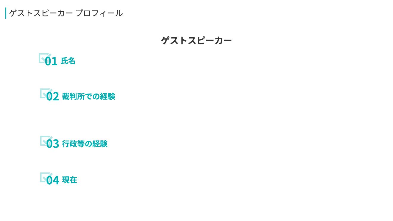 03行政等の経験 02裁判所での経験 01氏名 ゲストスピーカー プロフィール ゲストスピーカー 04現在
