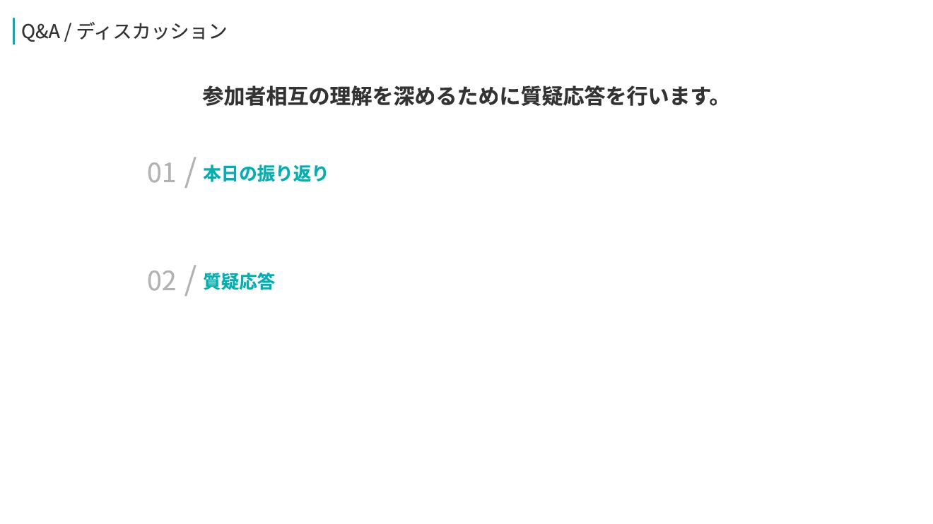 質疑応答 02/ 本日の振り返り 01/ Q&A / ディスカッション 参加者相互の理解を深めるために質疑応答を行います。