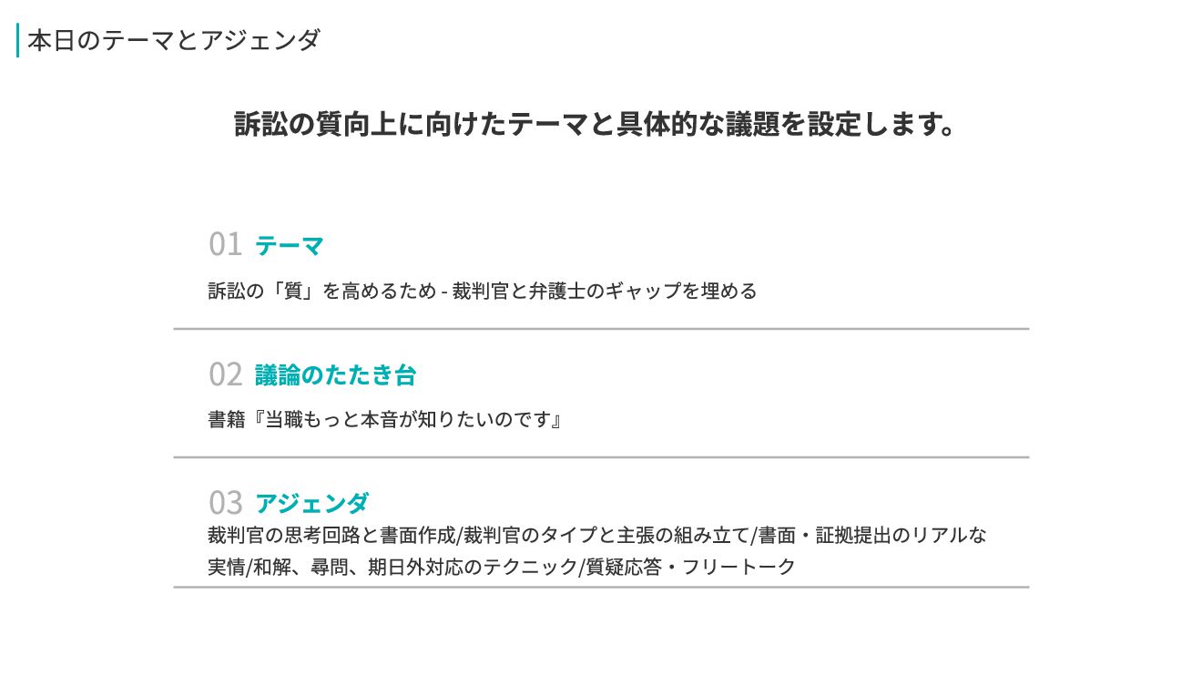 01 テーマ 本日のテーマとアジェンダ 訴訟の質向上に向けたテーマと具体的な議題を設定します。