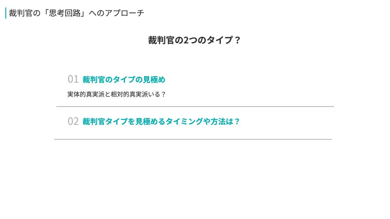 02 裁判官タイプを見極めるタイミングや方法は? 実体的真実派と相対的真実派いる? 01 裁判官のタイプの見極め 裁判官の「思考回路」へのアプローチ 裁判官の2つのタイプ?