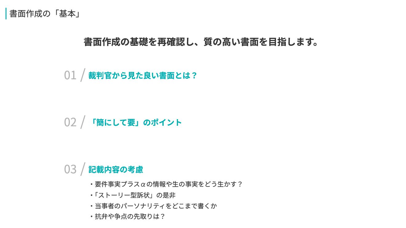 01/ 書面作成の「基本」 書面作成の基礎を再確認し、質の高い書面を目指します。