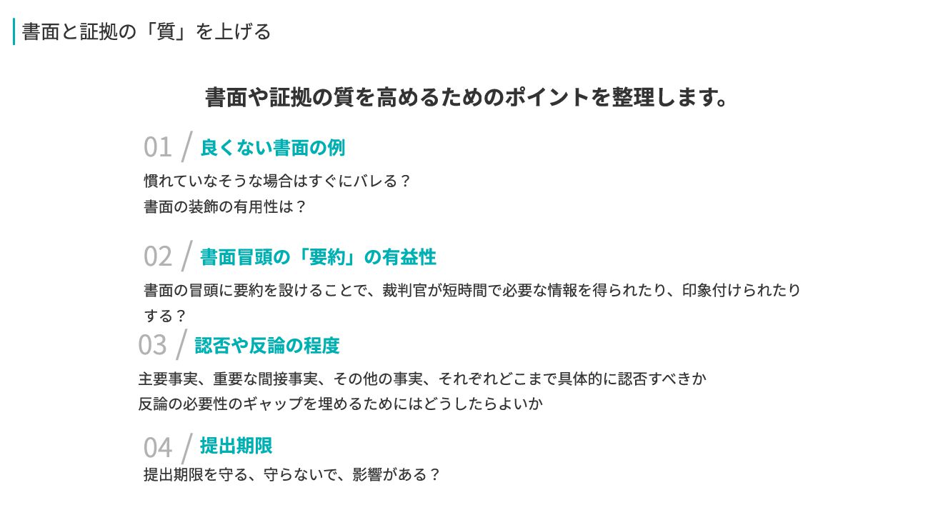 主要事実、重要な間接事実、その他の事実、それぞれどこまで具体的に認否すべきか 反論の必要性のギャップを埋めるためにはどうしたらよいか 提出期限を守る、守らないで、影響がある? 提出期限 04 / 書面の冒頭に要約を設けることで、裁判官が短時間で必要な情報を得られたり、印象付けられたり する? 書面冒頭の「要約」の有益性 02/
