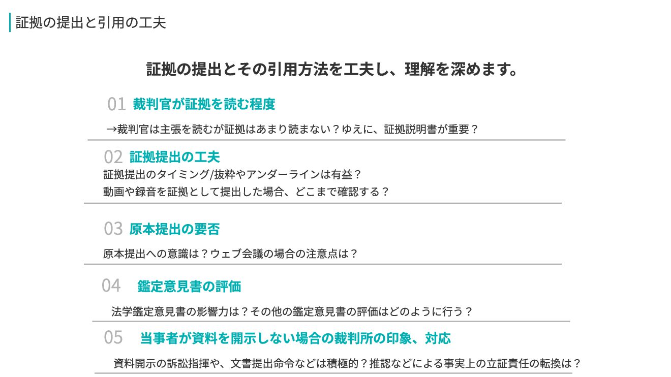 尋問で何に注目している? 02/ 尋問を通じて心証はどの程度変わる? 尋問での心証の変化 01/ 尋問・鑑定・和解のポイント 尋問や和解の方法を理解し、実践的な知識を深めます。 証拠申出書は重要? 03 /