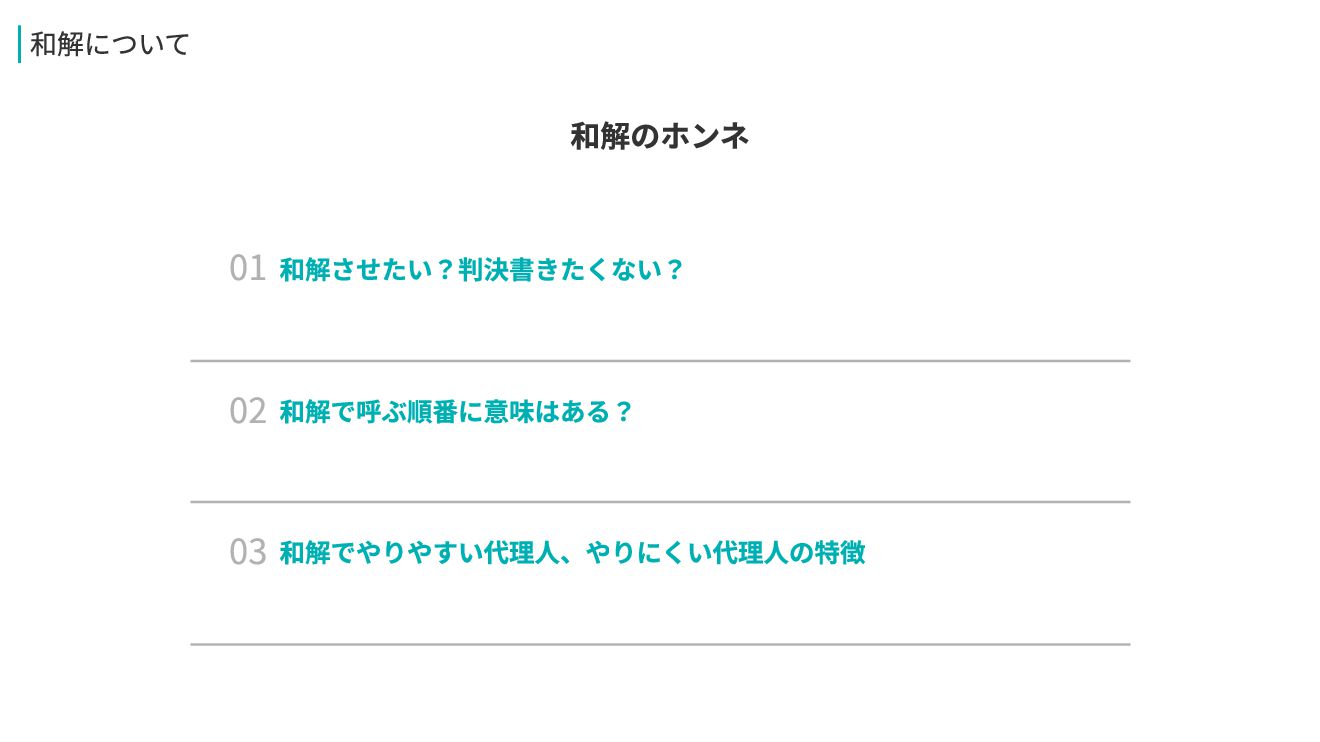 03 和解でやりやすい代理人、やりにくい代理人の特徴 02 和解で呼ぶ順番に意味はある? 01 和解させたい?判決書きたくない? 和解について 和解のホンネ