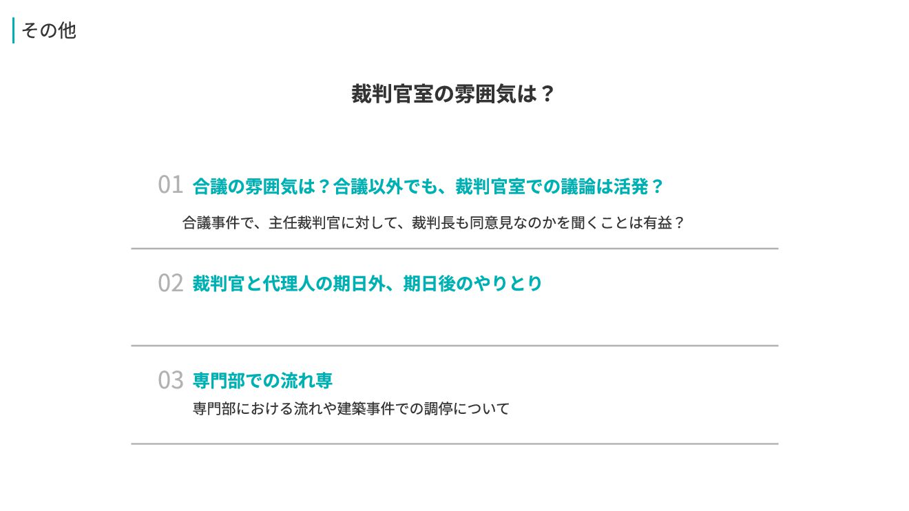 03 専門部での流れ専 02 裁判官と代理人の期日外、期日後のやりとり 専門部における流れや建築事件での調停について 01 合議の雰囲気は?合議以外でも、裁判官室での議論は活発? その他 裁判官室の雰囲気は? 合議事件で、主任裁判官に対して、裁判長も同意見なのかを聞くことは有益?