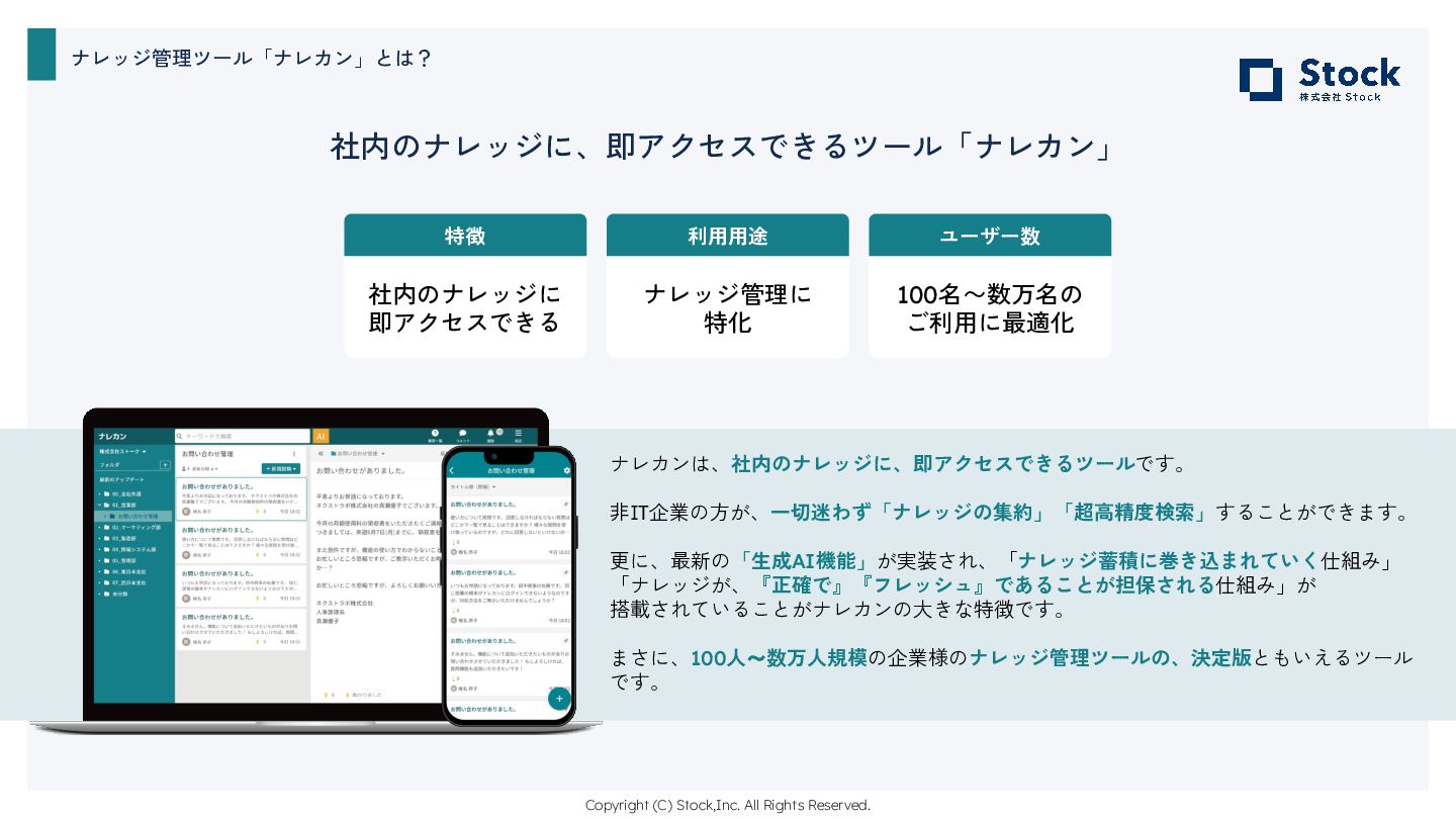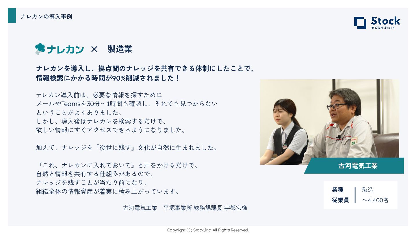 情報検索にかかる時間が90%削減されました! ナレカン導入前は、必要な情報を探すために メールやTeamsを30分〜1時間も確認し、それでも見つからない ということがよくありました。 しかし、導入後はナレカンを検索するだけで、 欲しい情報にすぐアクセスできるようになりました。 加えて、ナレッジを『後世に残す』文化が自然に生まれました。 『これ、ナレカンに入れておいて』と声をかけるだけで、 自然と情報を共有する仕組みがあるので、 ナレッジを残すことが当たり前になり、 組織全体の情報資産が着実に積み上がっています。 古河電気工業 平塚事業所 総務課課長 宇都宮様 業種 従業員 製造 〜4,400名 古河電気工業
