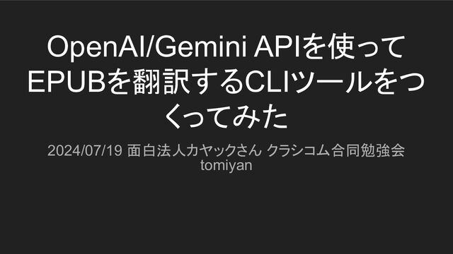 2024/07/19 面白法人カヤックさん クラシコム合同勉強会 https://zenn.dev/tomiyan/articles/b02c973f7ed845 https://github.com/tomiyan/trans-epub