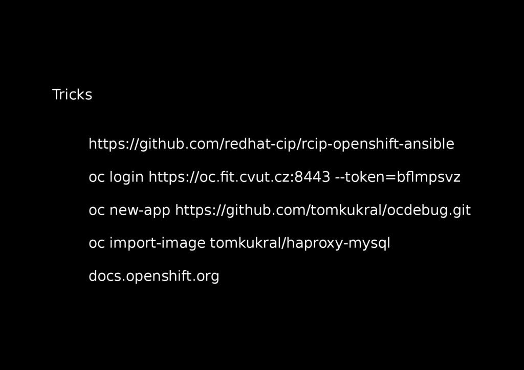 Tricks https://github.com/redhat-cip/rcip-openshift-ansible oc login https://oc.fit.cvut.cz:8443 --token=bflmpsvz oc new-app https://github.com/tomkukral/ocdebug.git oc