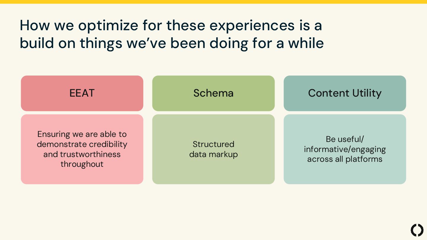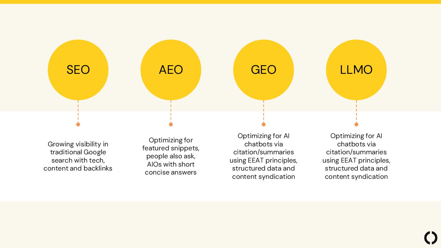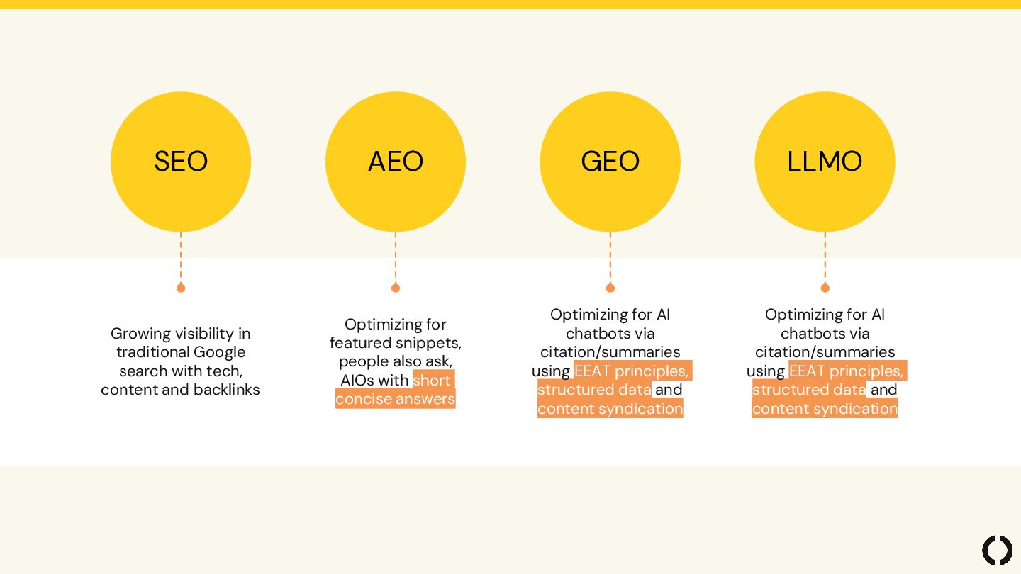 backlinks Optimizing for featured snippets, people also ask, AIOs with short concise answers Optimizing for AI chatbots via citation/summaries using EEAT principles, structured data and content syndication Optimizing for AI chatbots via citation/summaries using EEAT principles, structured data and content syndication SEO LLMO AEO GEO